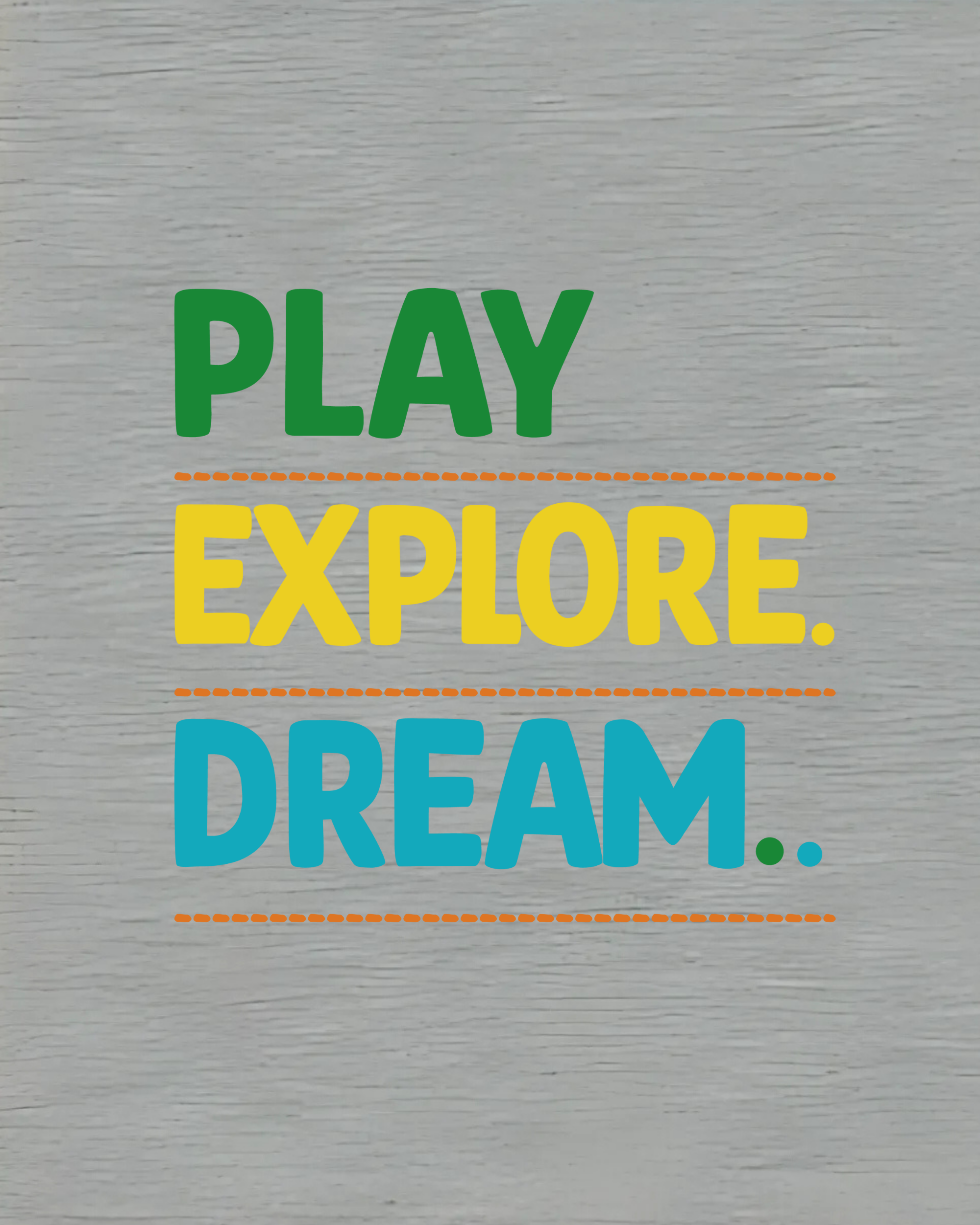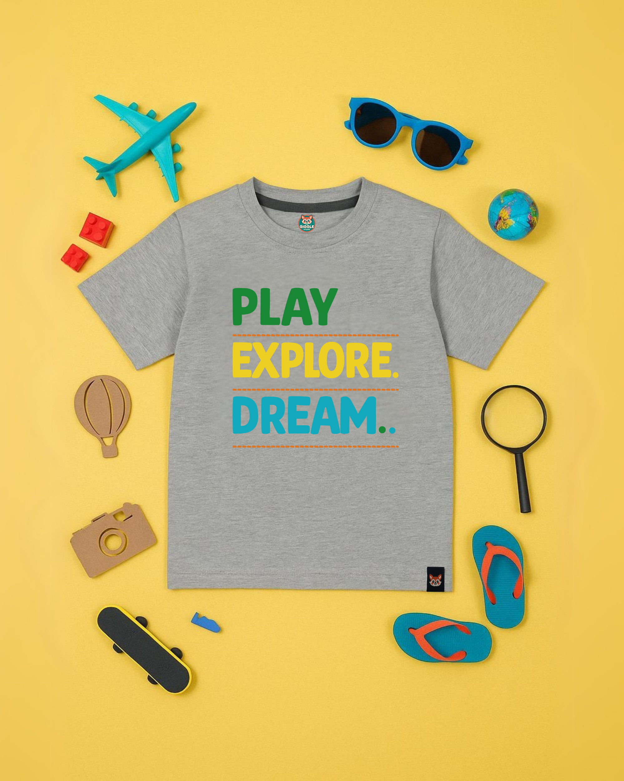 Heather grey cotton tee with bold multicolor DTF text print reading “Play. Explore. Dream.” Soft, breathable, and made for curious souls and creative minds.